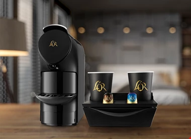 Pour proposer à vos clients un instant café privilégié dans leur chambre d'hôtel, découvrez la machine à capsules et le plateau de courtoisie L'OR Professional.